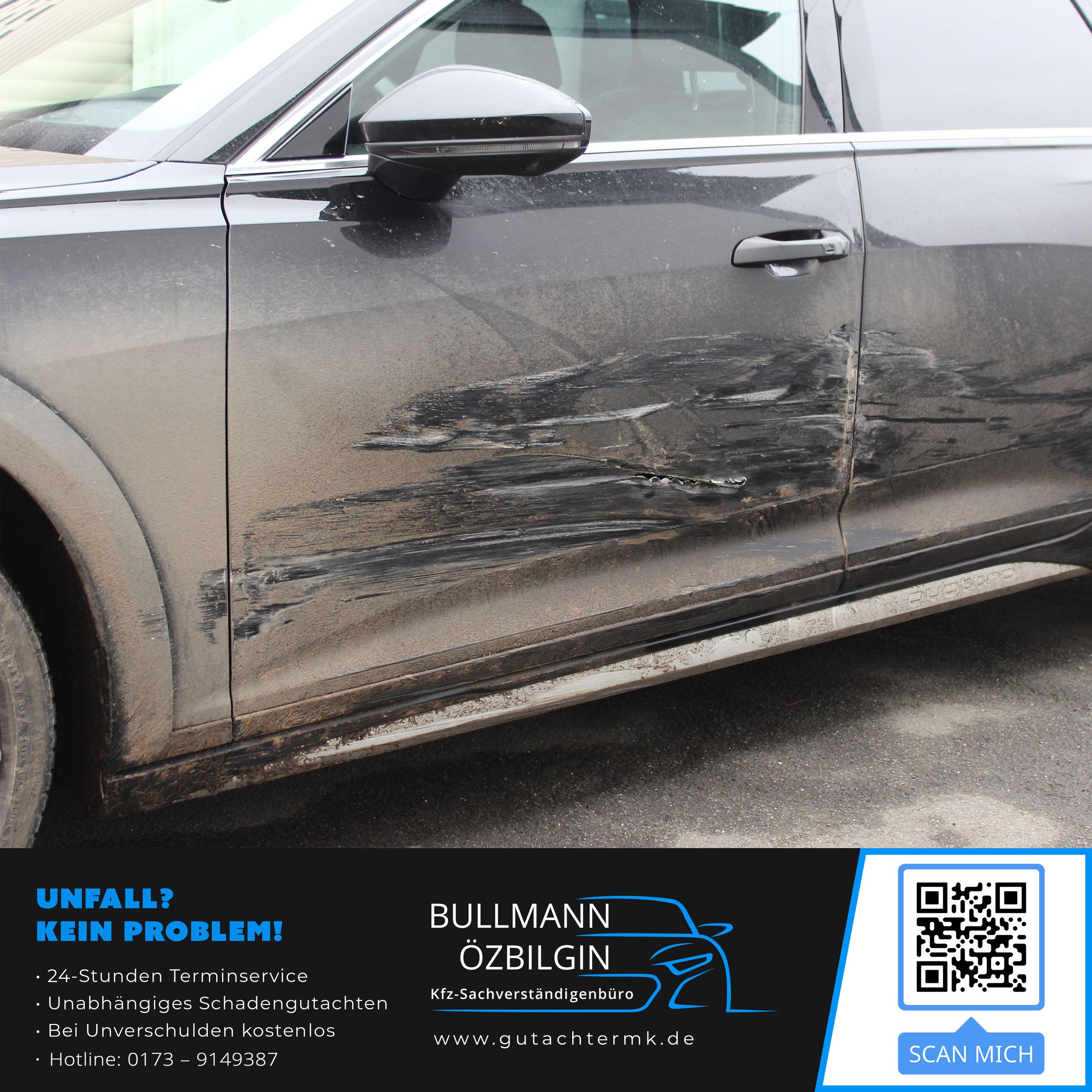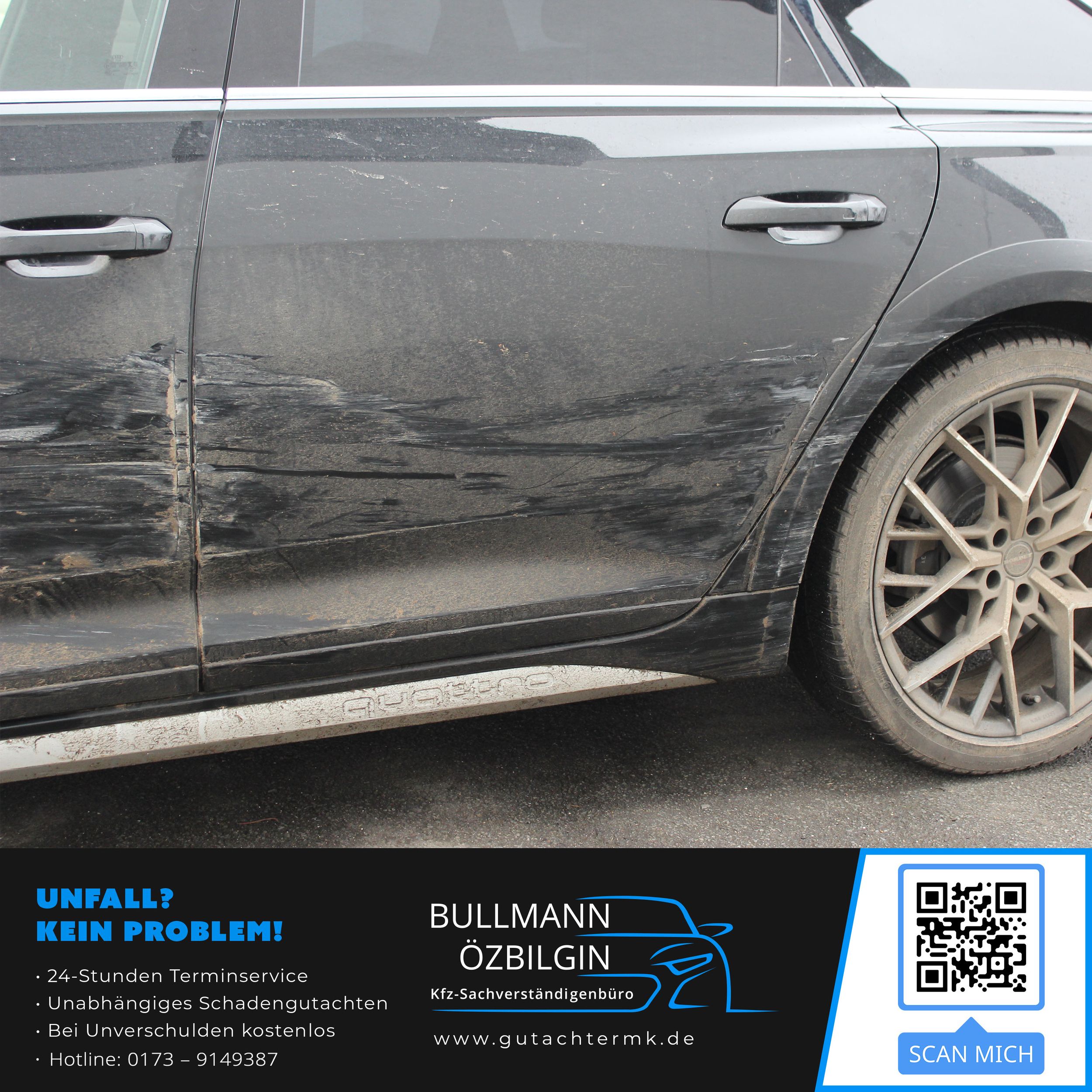 Schadenbeschreibung: Erneuerung Seitenwand vorne links, Tür vorne links, Tür hinten links, Seitenwand hinten links, Unterholm links, Seitenspiegel links, Türgriff vorne links