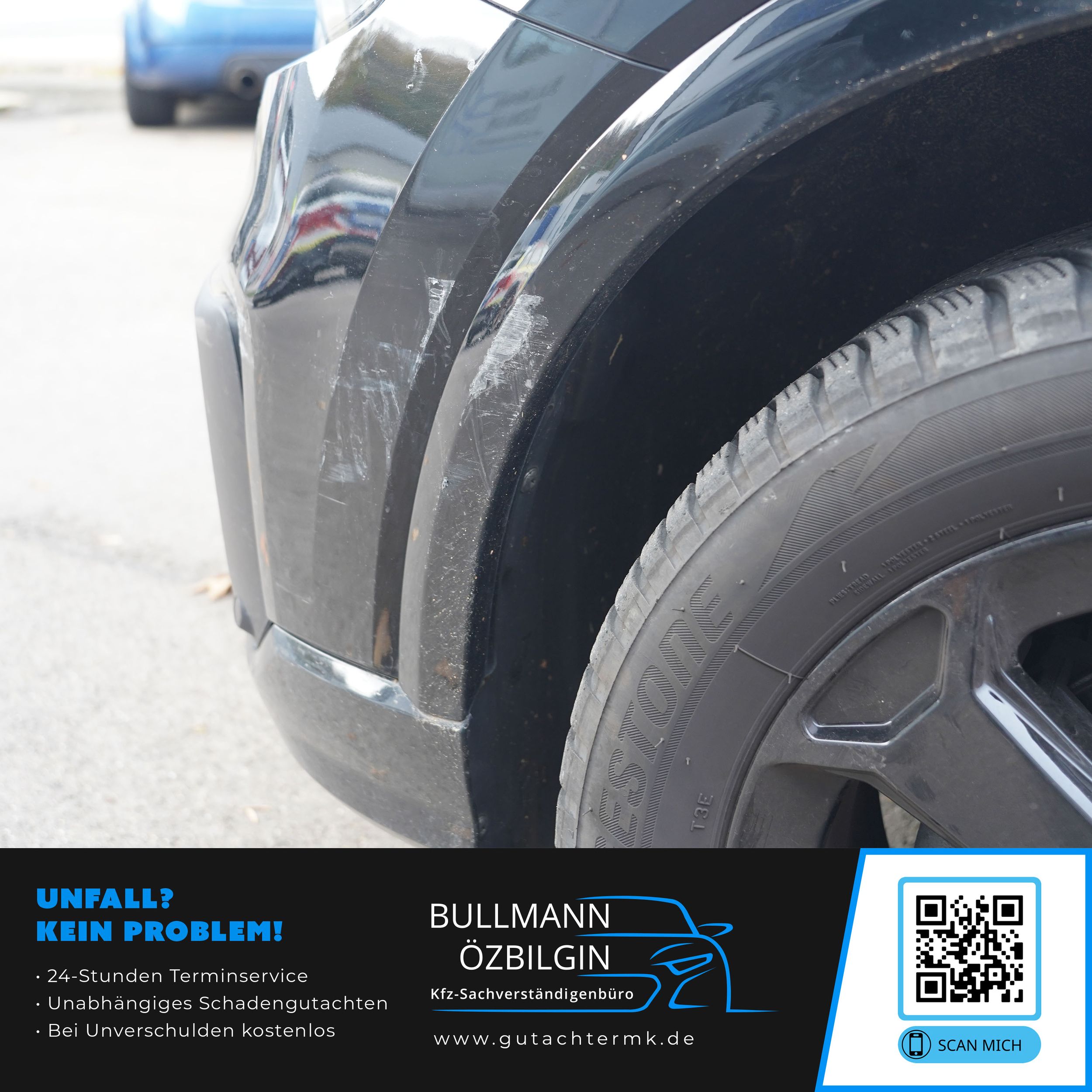 Schadenbeschreibung: Erneuerung Stoßfänger vorne, Seitenwand vorne links