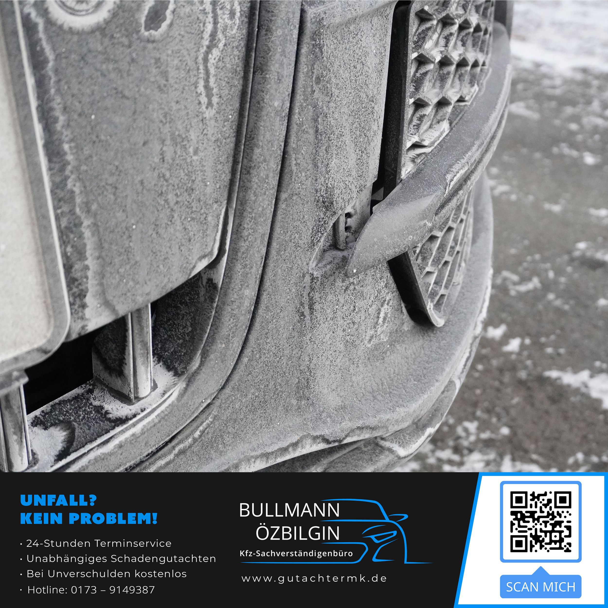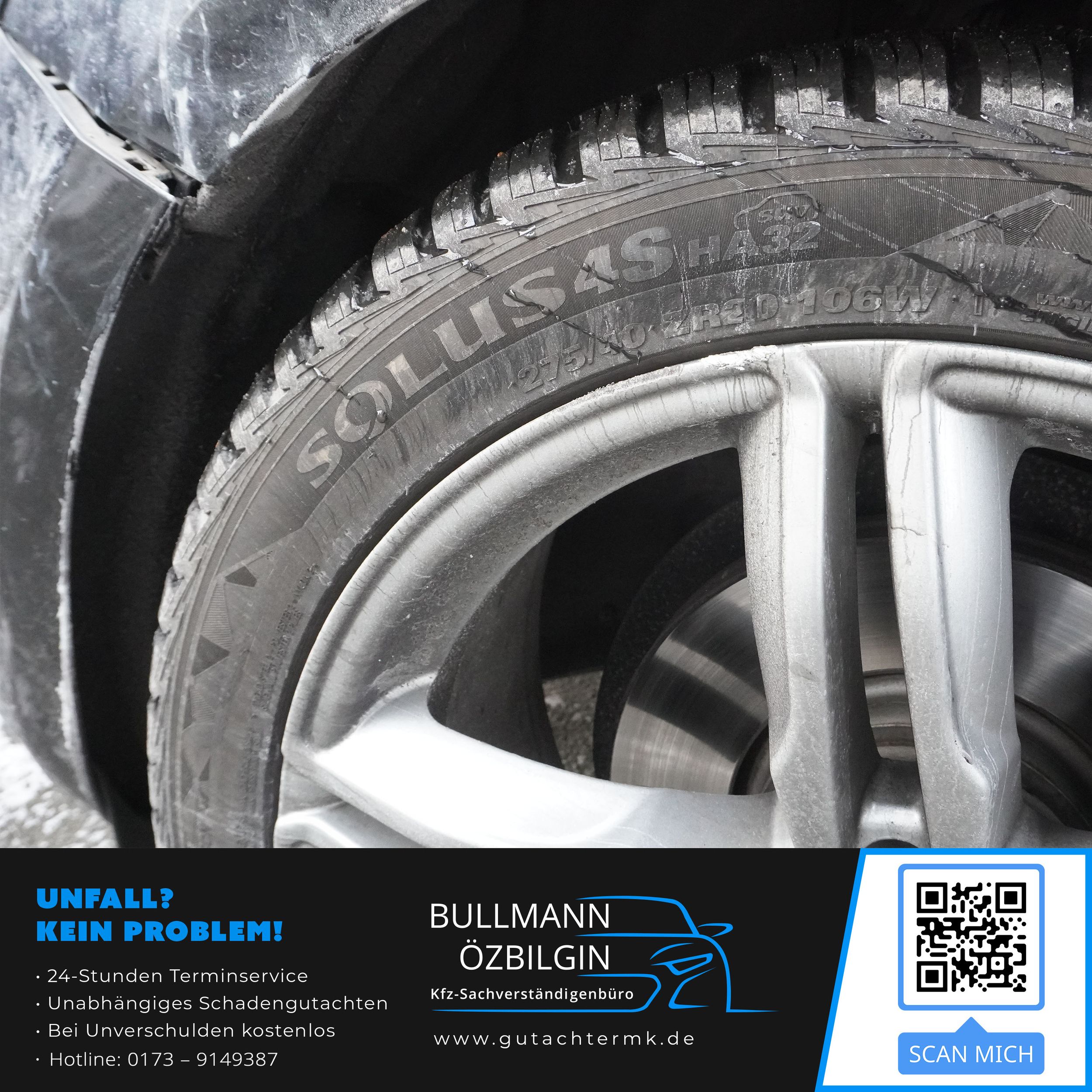 Schadenbeschreibung: Erneuerung Stoßfänger vorne, Seitenwand vorne links, Scheinwerferhalter vorne links, Leichtmetallfelgen vorne links, Reifen vorne links