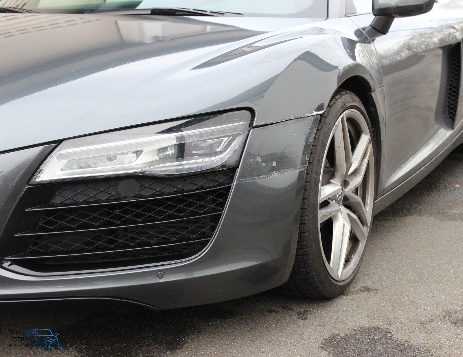 Schadenbeschreibung: Erneuerung Scheinwerfer vorne links, Stoßfänger vorne links, Kotflügel vorne links, Felge vorne links, Reifen li/re, Tür vorne links, Seitenwand links (Side Blades).