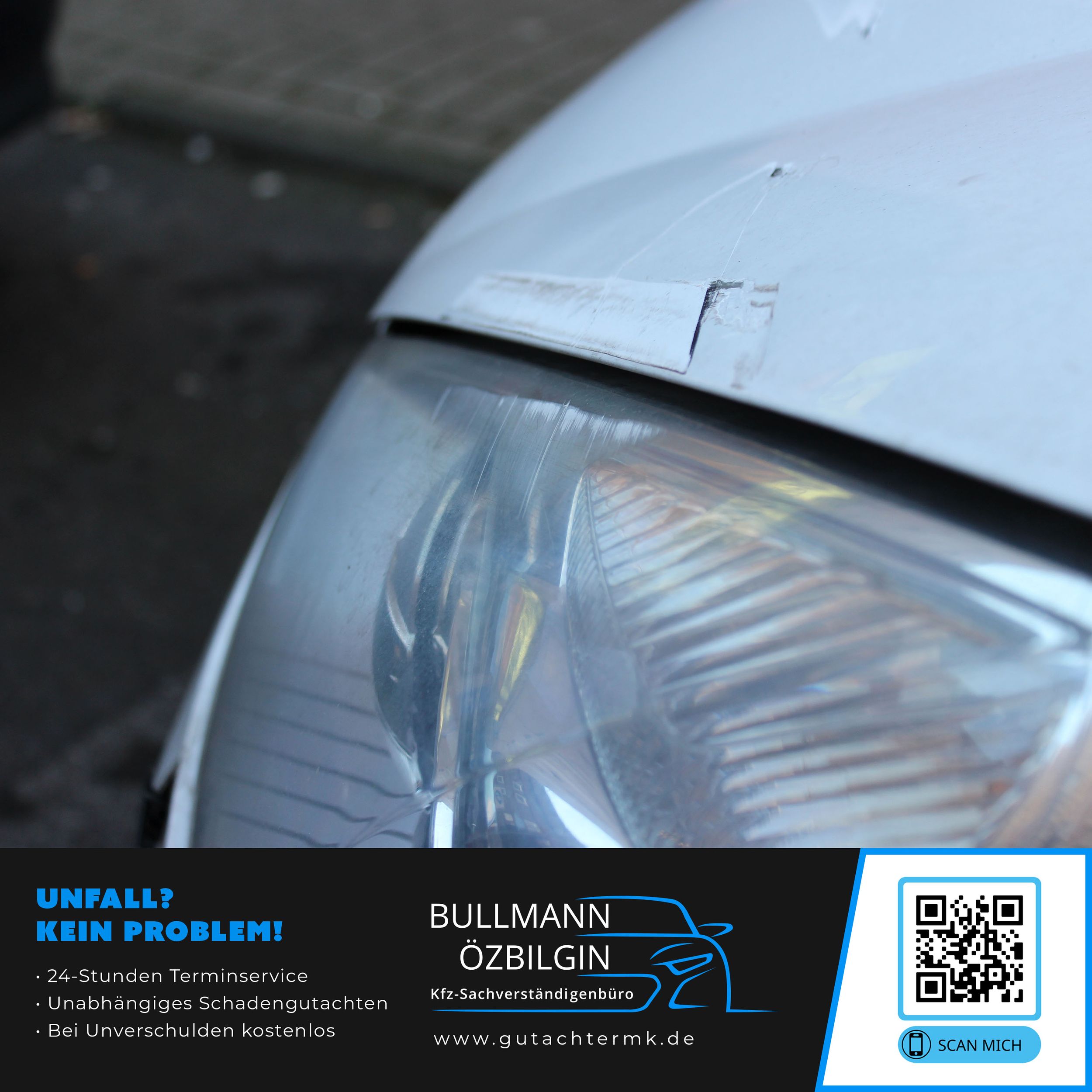 Schadenbeschreibung: Erneuerung Seitenwand vorne links, Stößfänger vorne, Motorhaube, Scheinwerfer vorne links, PDC-Sensoren außen links, Nebelscheinwerfer links