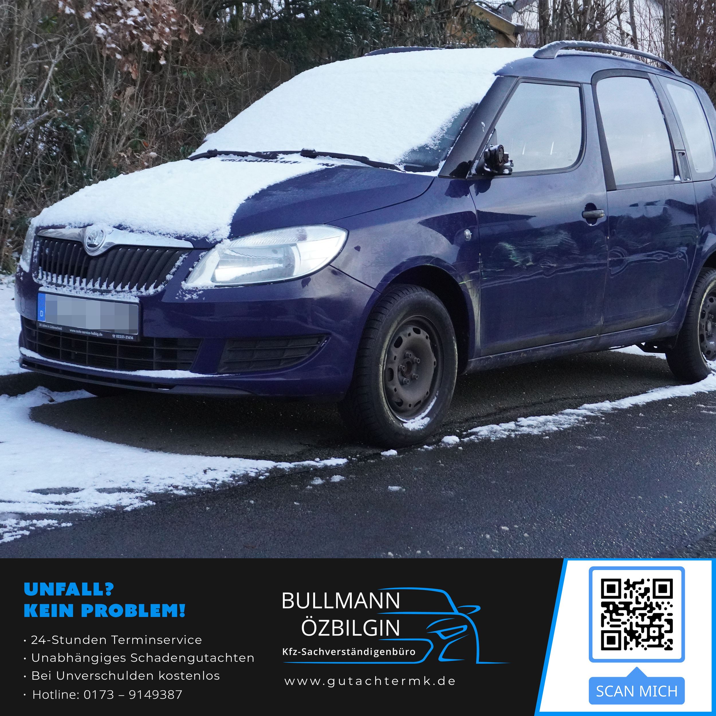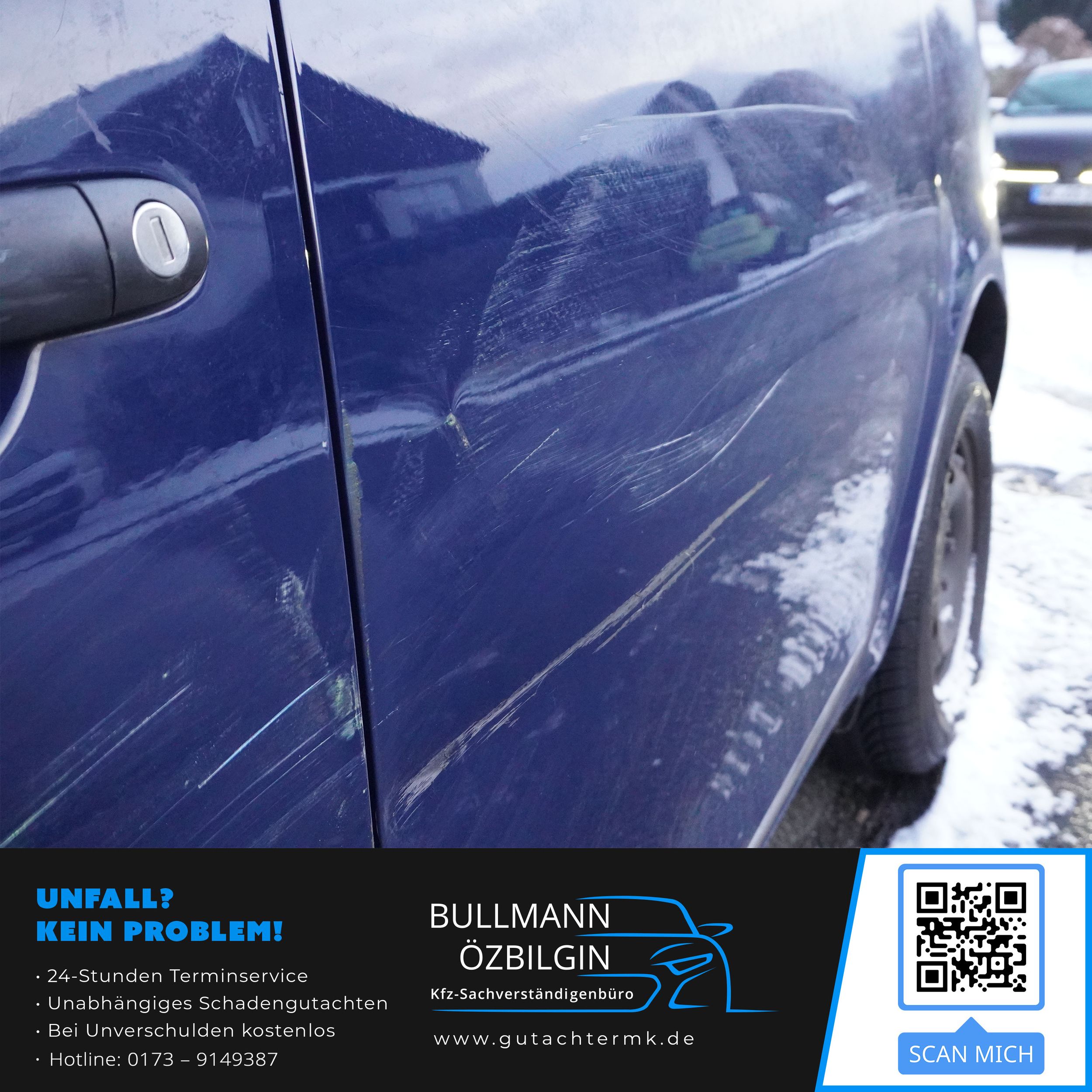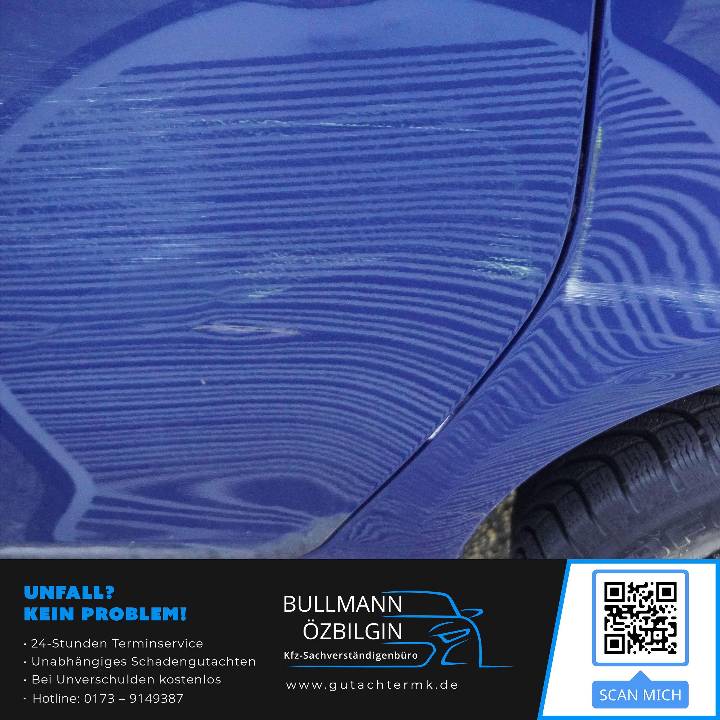 Schadenbeschreibung: Erneuerung Stoßfänger hinten, Seitenwand hinten links, Tür hinten links, Tür vorne links, Seitenwand vorne links