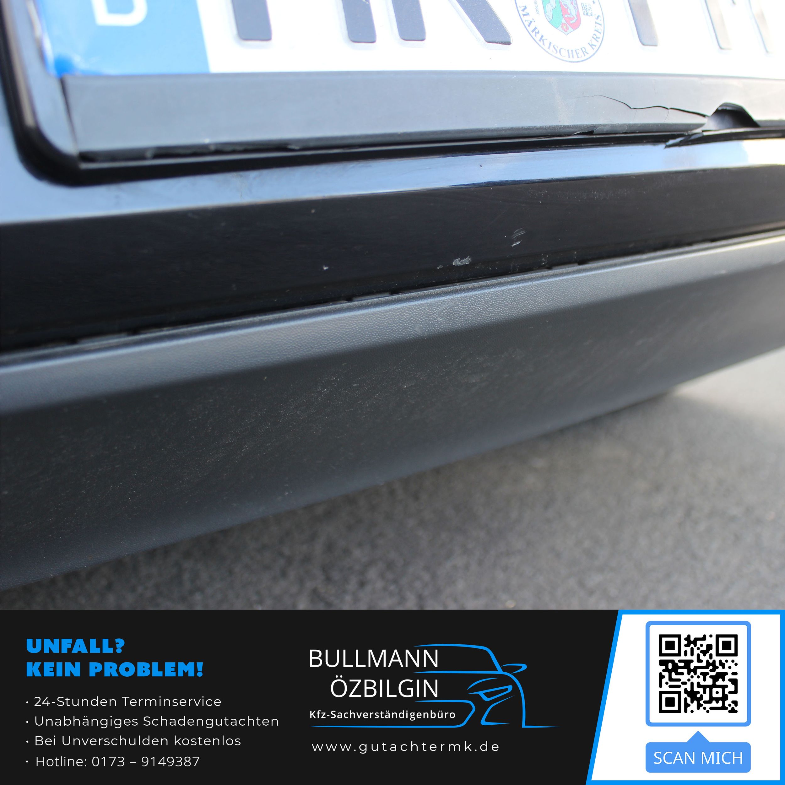 Schadenhergang: Schadenbeschreibung: Erneuerung Stoßfänger hinten, Stoßfänger Unterteil hinten, Endschalldämpfer Reparaturkosten: 2.664,22€Wertminderung: Entfällt Schadenart: Weiteres: