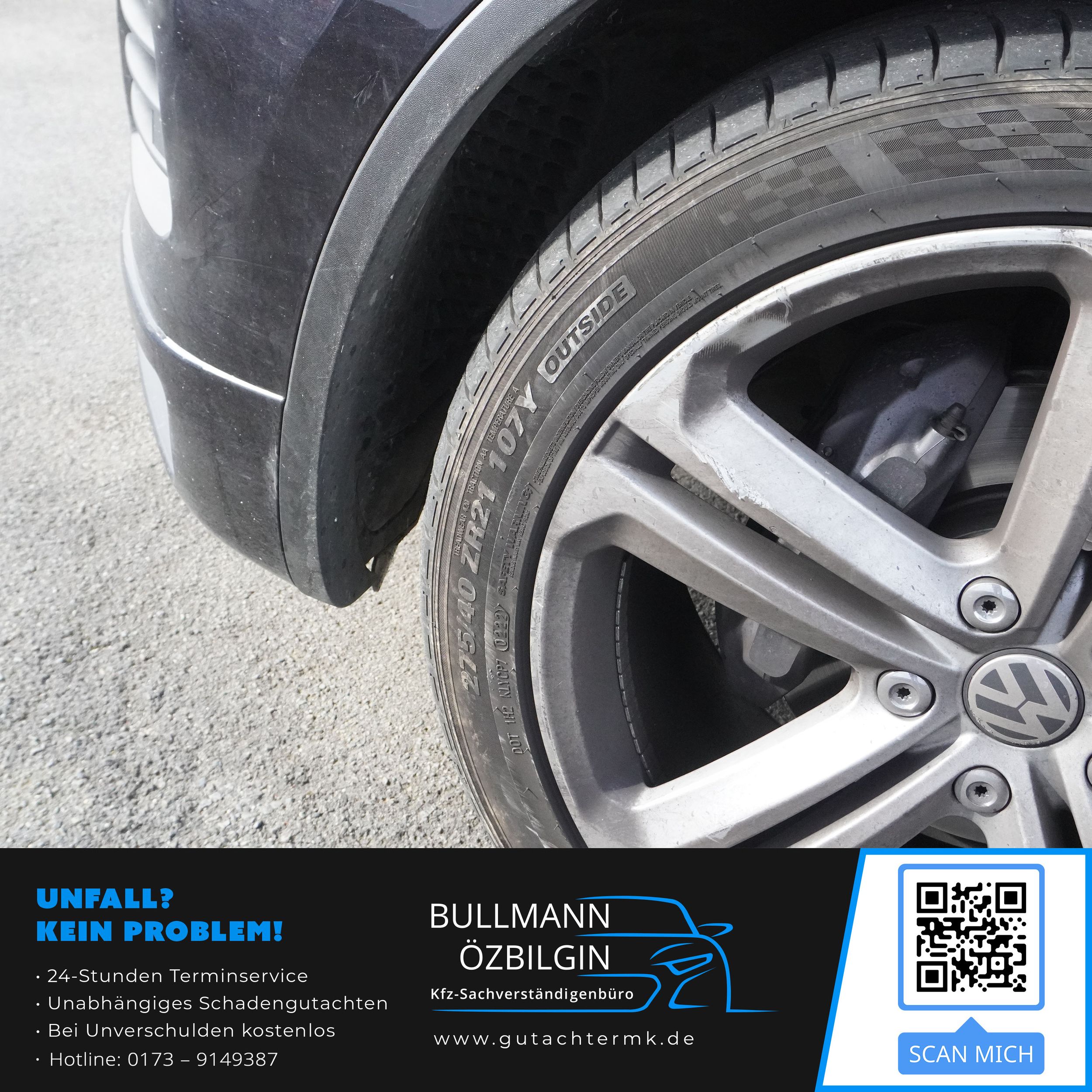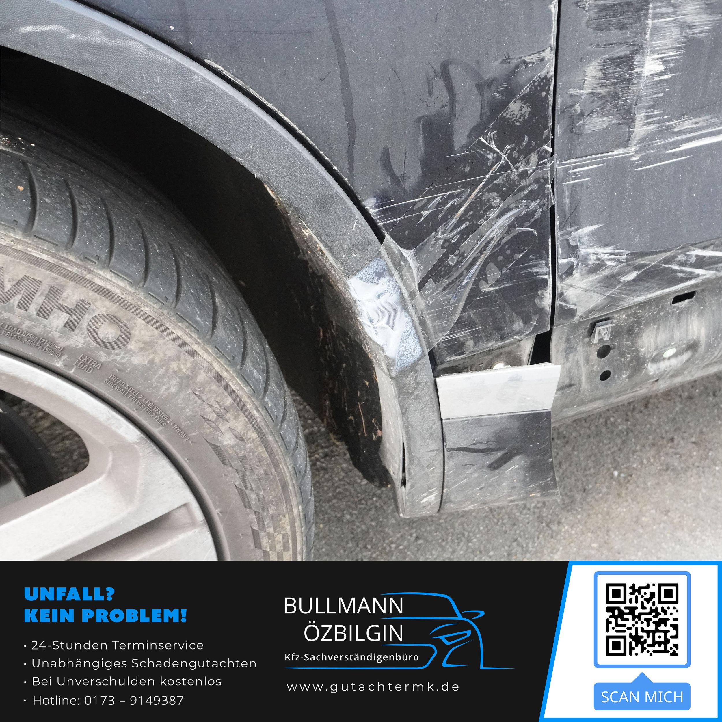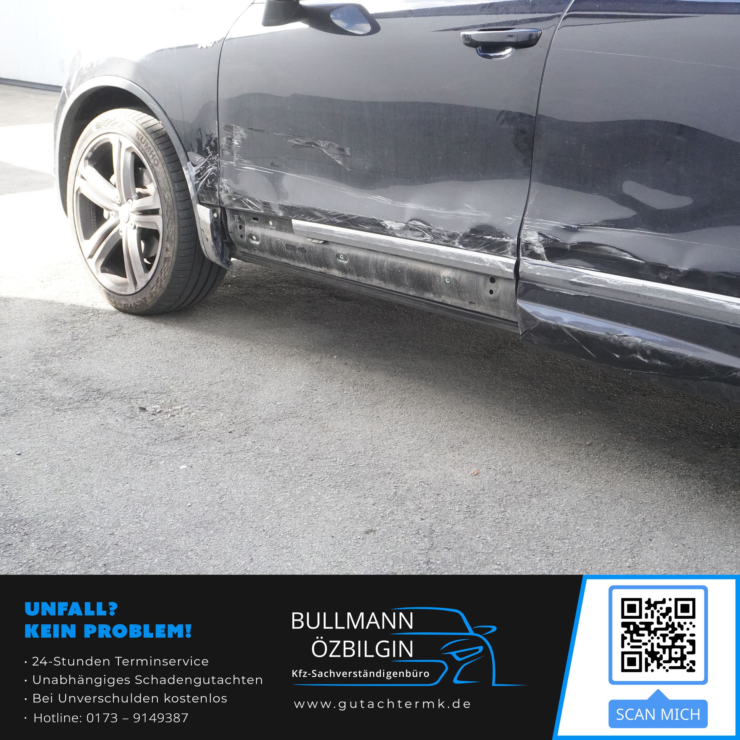 Schadenbeschreibung: Erneuerung Stößfänger vorne, Rad vorne links, Seitenwand vorne links, Tür vorne links, Tür hinten links, Seitenwand hinten links